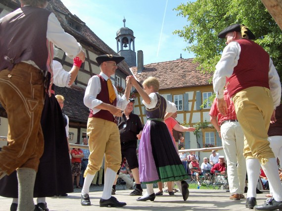 Volkslieder, traditionelle Tänze und fränkischer Dialekt erwecken den Dorfplatz vor der Kirchenburg zum Leben.