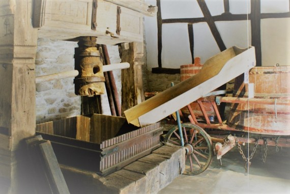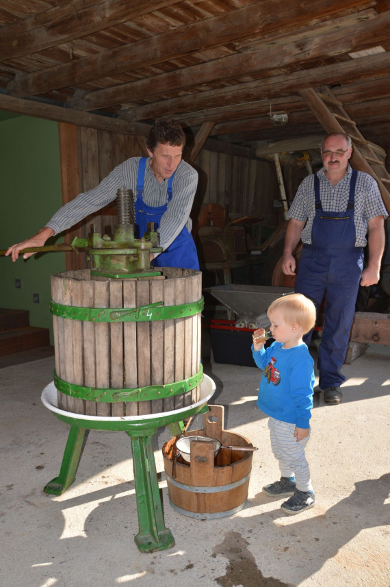 Erleben Sie landwirtschaftliche Erntearbeiten wie sie früher waren: Dreschen mit Dreschflegel und Dreschmaschine, Klee „aufbocken“, Äpfel und Trauben keltern, Weißkraut einstampfen und Buttern mit dem historischen Butterfass.